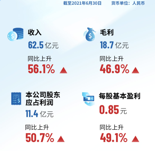 2021年上半年,集團業績實現高質量發展。公告顯示,集團上半年營業額為人民幣62.47億元,較去年同期增長56.1%;毛利18.73億元,同比增加46.9%,毛利率為30.0%;股東應占利潤為11.42億元,同比增加50.7%。每股基本盈利為0.85元。