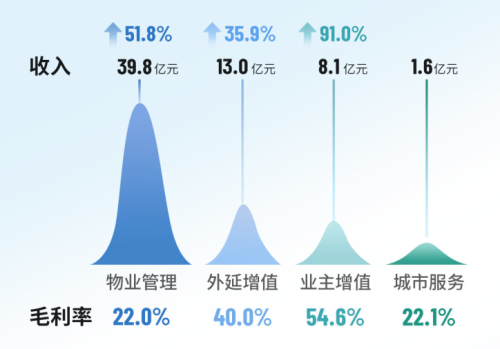 通過精細化運營及科技賦能,雅生活集團運營效益穩步提升,收入結構進一步優化,核心業務占比提升至近八成,核心業務毛利占比超七成。其中,物業管理服務收入同比增長51.8%至39.77億,外延增值服務收入同比增長35.9%至13.03億元,業主增值服務收入同比增長90.9%至8.07億元,城市服務收入達1.59億元。